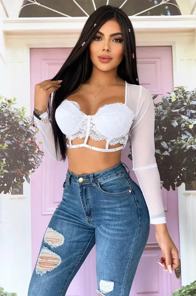 Este top combina sensualidad y estilo con su diseño en encaje y detalles transparentes. Las mangas largas de malla aportan un toque delicado, mientras que el bustier de encaje crea una silueta favorecedora y sofisticada. Con su estilo atrevido y moderno, este top es ideal para combinar con jeans o faldas. Disponible color negro y blanca , talla unica