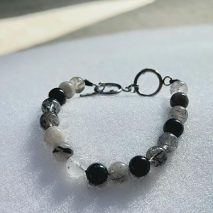 Pulsera piedra natural en la cual podemos apreciar esos tonos transparente y Blanco del cuarzo y en su interior intensos fragmentos negros de la piedra turmalina con un broche circular en acero color plateado.